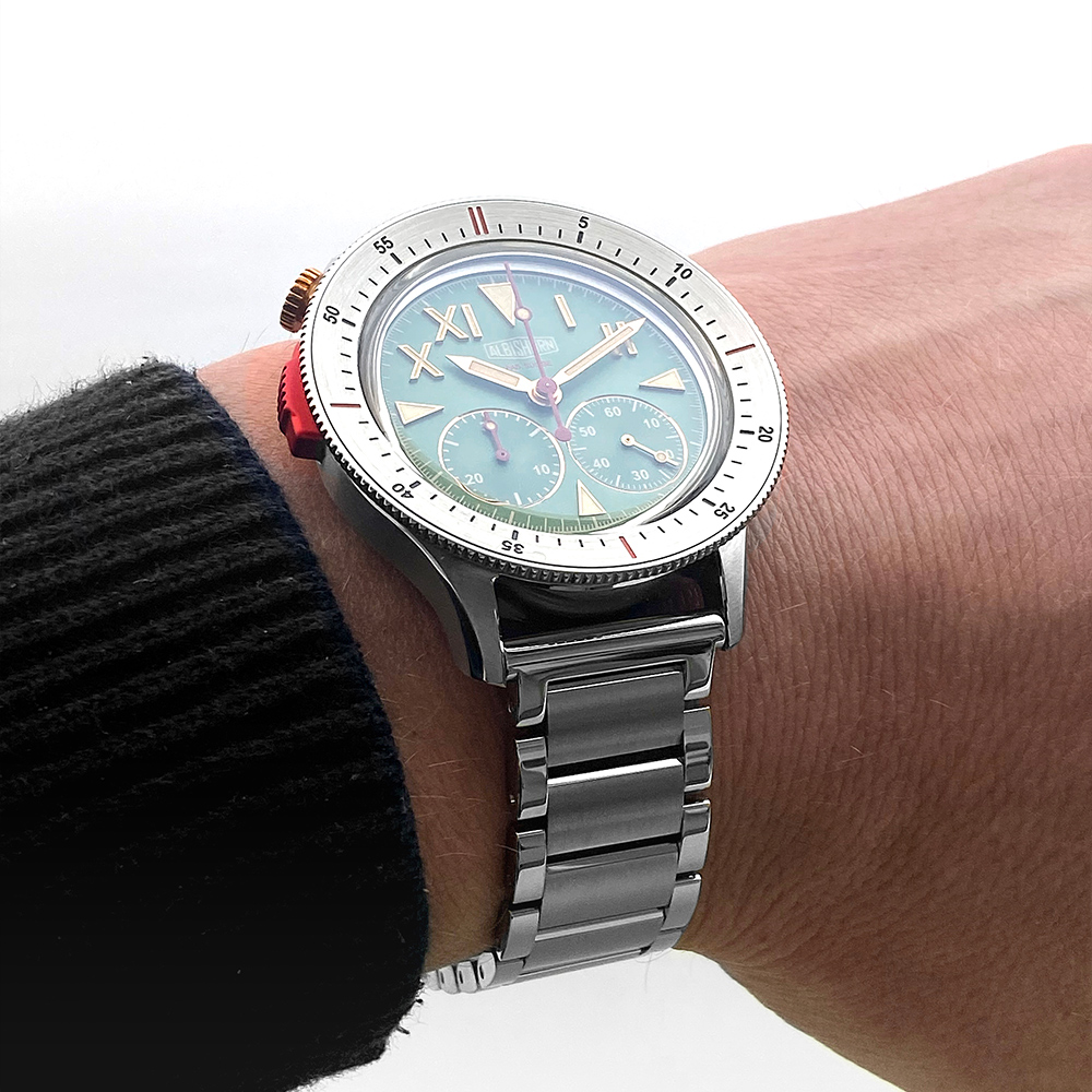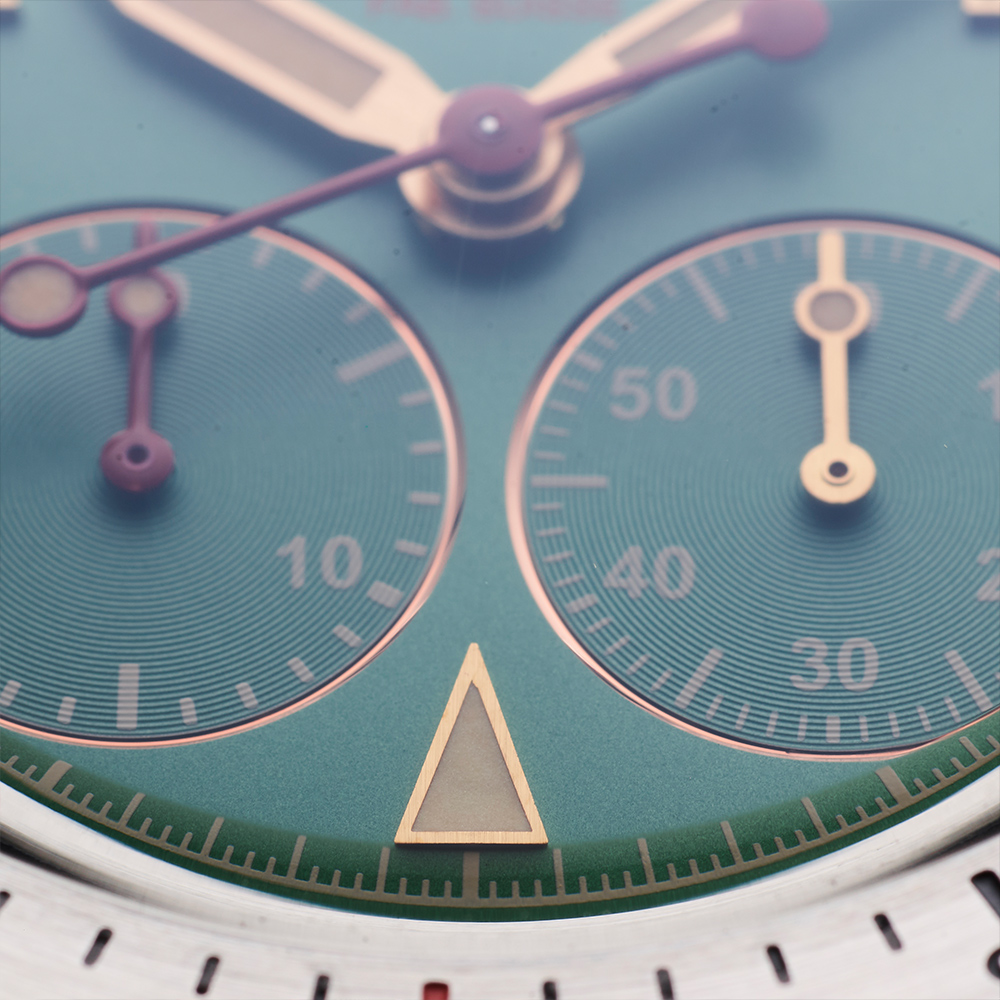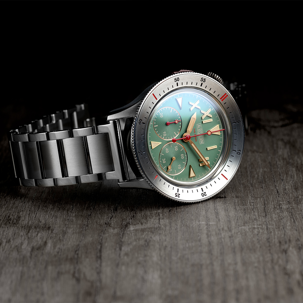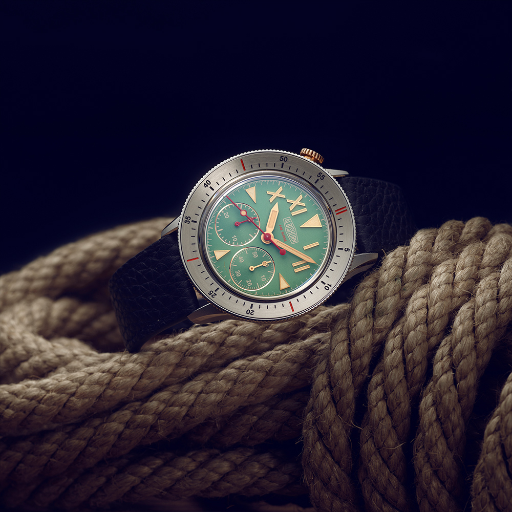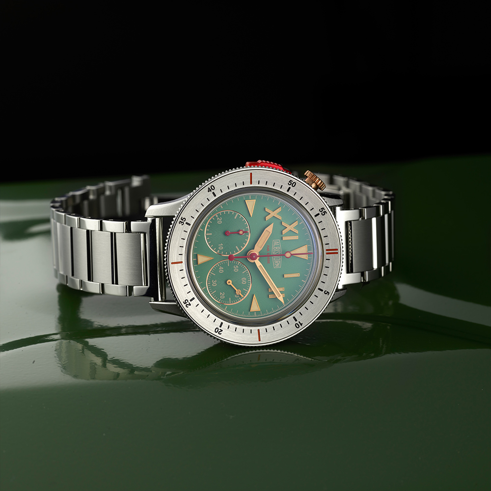 Albishorn specifically developed this movement to showcase the Thundergraph's distinctive dial layout, featuring subdials positioned at 4:30 and 7:30 respectively. The standout attribute of Albishorn's movement is its remarkable height of only 5.70 mm, enabling the production of particularly thin chronographs reminiscent of the 1950s. Another notable feature is the single pusher located at 9:30, allowing for effortless access and operation.