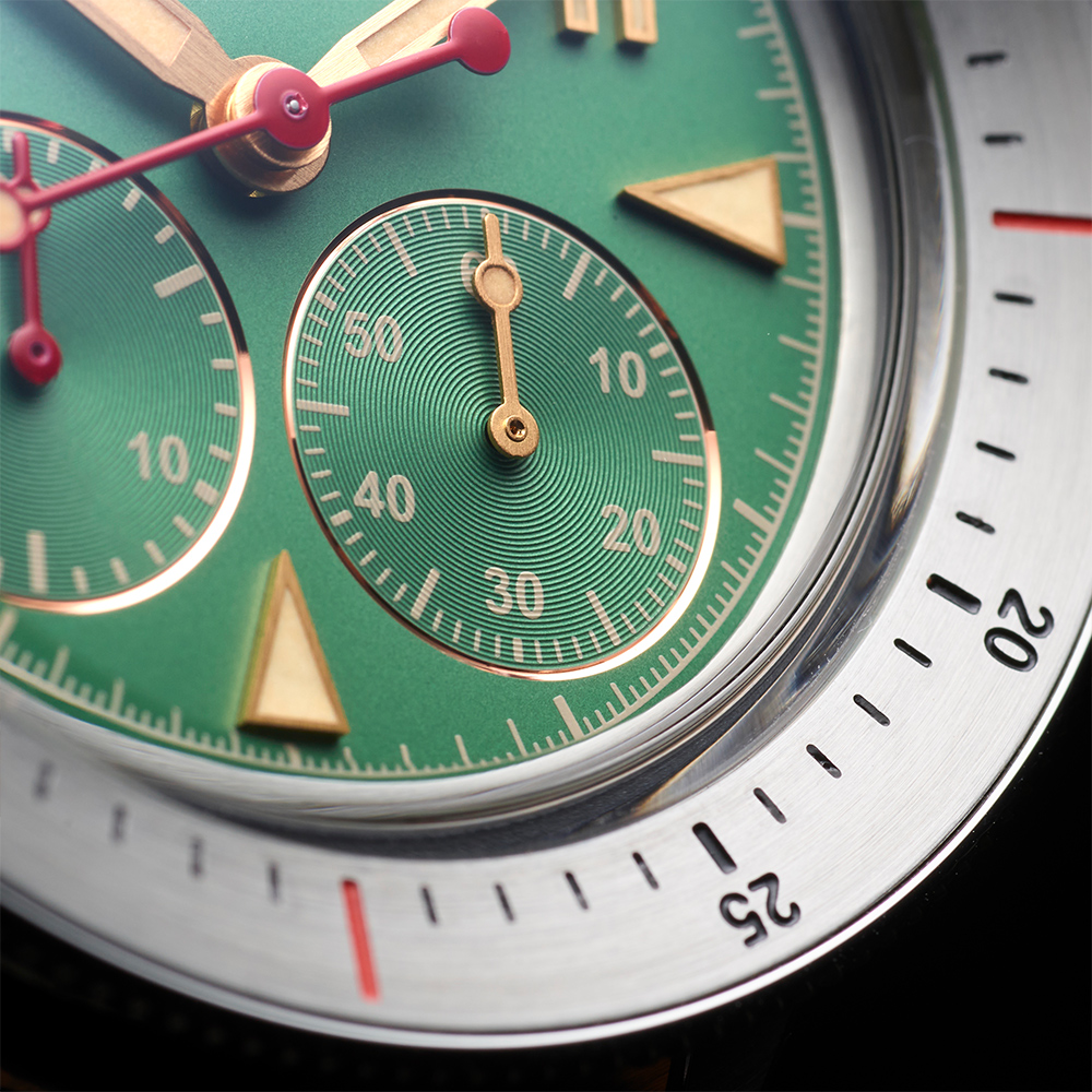 The Thundergraph's oversized turning bezel is a standout feature, elevating its functionality and distinguishing it as a tool watch tailored to the requirements of its intended users. The conical bezel that widens from the case to the exterior introduces an intriguing visual element to the Thundergraph's design. This particular bezel shape not only adds depth and dimension to the watch but also enhances its overall aesthetics, making it stand out from traditional bezel designs. Its knurled edge provides a firm grip, allowing for effortless rotation even while wearing gloves or in challenging conditions.