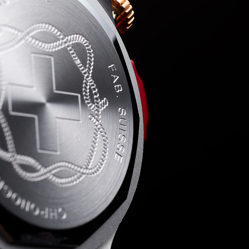 The case back is engraved with a Swiss cross and a rope, inspired by the emblem of the Foundation for Alpine Research at the time.